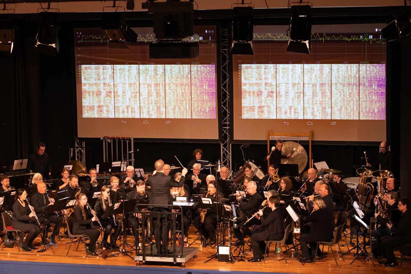 Mit diesem Konzertprogramm konnten wir am 5. Oktober 2025 rund 600 Zuhörer*innen im fast ausverkauften alten Audimax am Campus Duisburg ins Quantenreich entführen. Zwischen der Musik führten Prof. Axel Lorke und Dr. Nicolas Wöhrl, Experimentalphysiker der Universität Duisburg-Essen, unterhaltsam durch spannende Themen der Quantenwissenschaften. Wie Schallwellen auf einem Blech den Atomaufbau veranschaulichen, was Posaunen und Nanopartikel verbindet und vieles mehr konnte man hier erfahren. Das musikalische Programm mit Filmmelodien aus Disney's "Aladdin" und Disney/Pixar's "Oben" sowie physikalisch inspirierten Werken wie "Lux Aurumque" (Licht und Gold) oder "Shock Wave" begeisterte zu viel Applaus und zwei Zugaben.